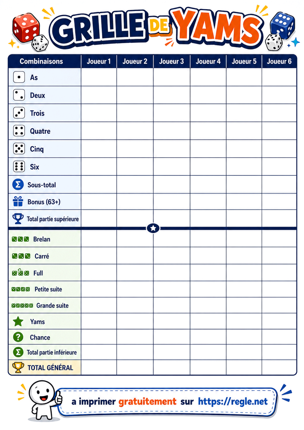 Notez que vous pourrez également jouer au yahtzee en ligne si vous n'avez pas de quoi y jouer IRL :) Vous y trouverez également les règles du jeu et il est possible de télécharger des grilles à imprimer. Le comptage des points ainsi que les combinaisons à réalisées sont strictement les mêmes que pour le yams simple décrit ici, à la différence que la grille comporte trois colonnes au lieu d'une. Elles doivent être remplies dans des ordres différents, montée, descente et libre, ce qui ajoute une dimension stratégique au jeu intéressante !